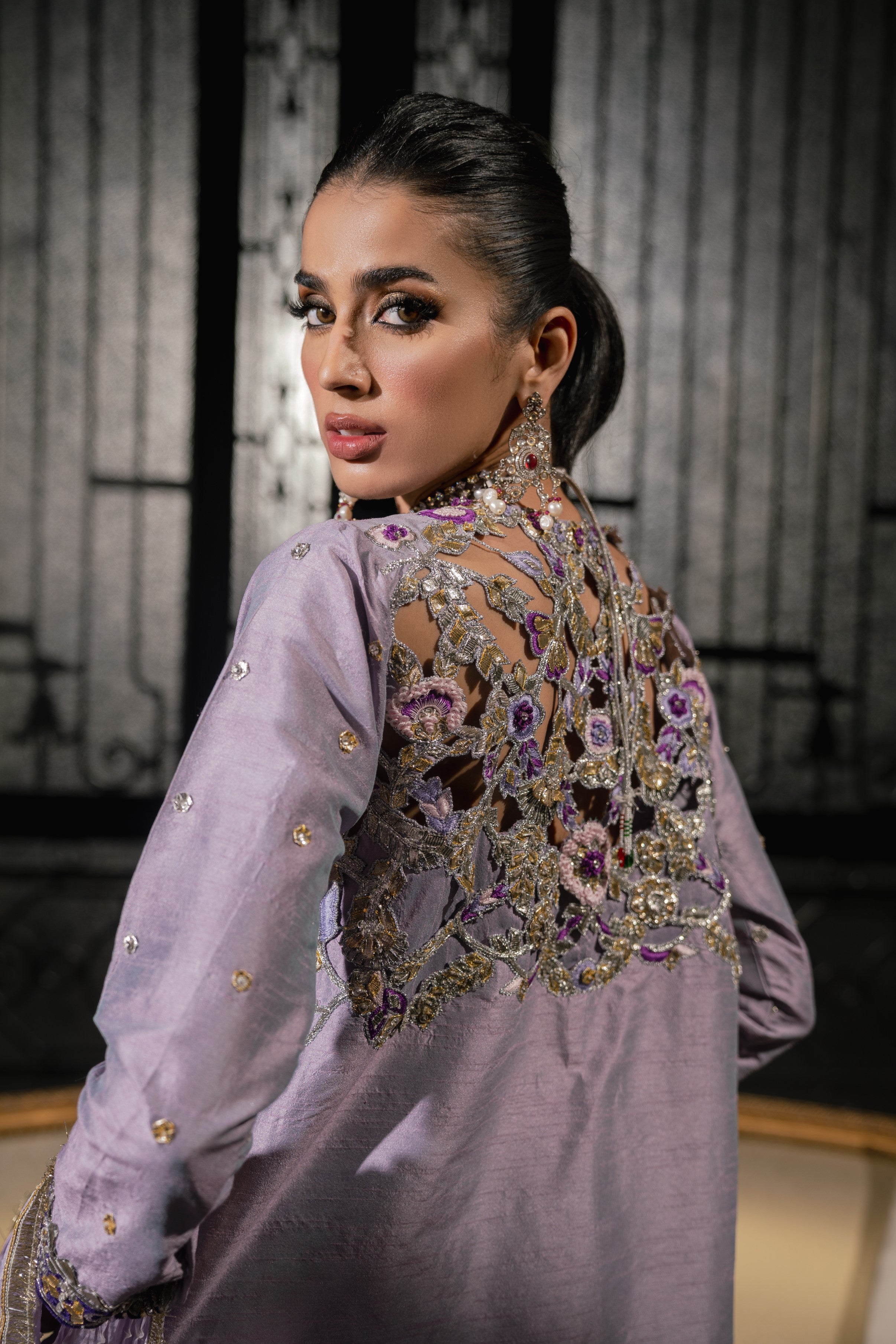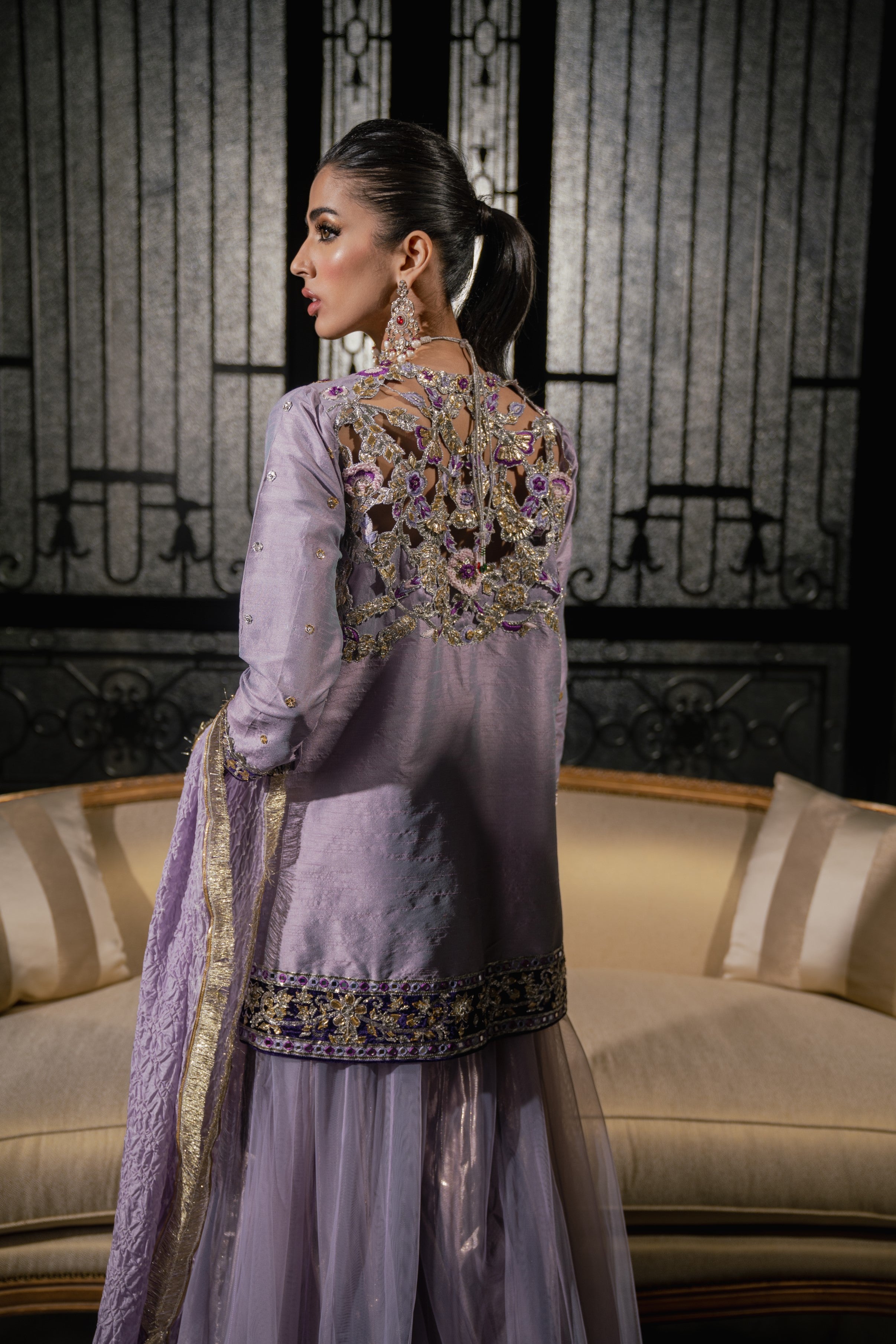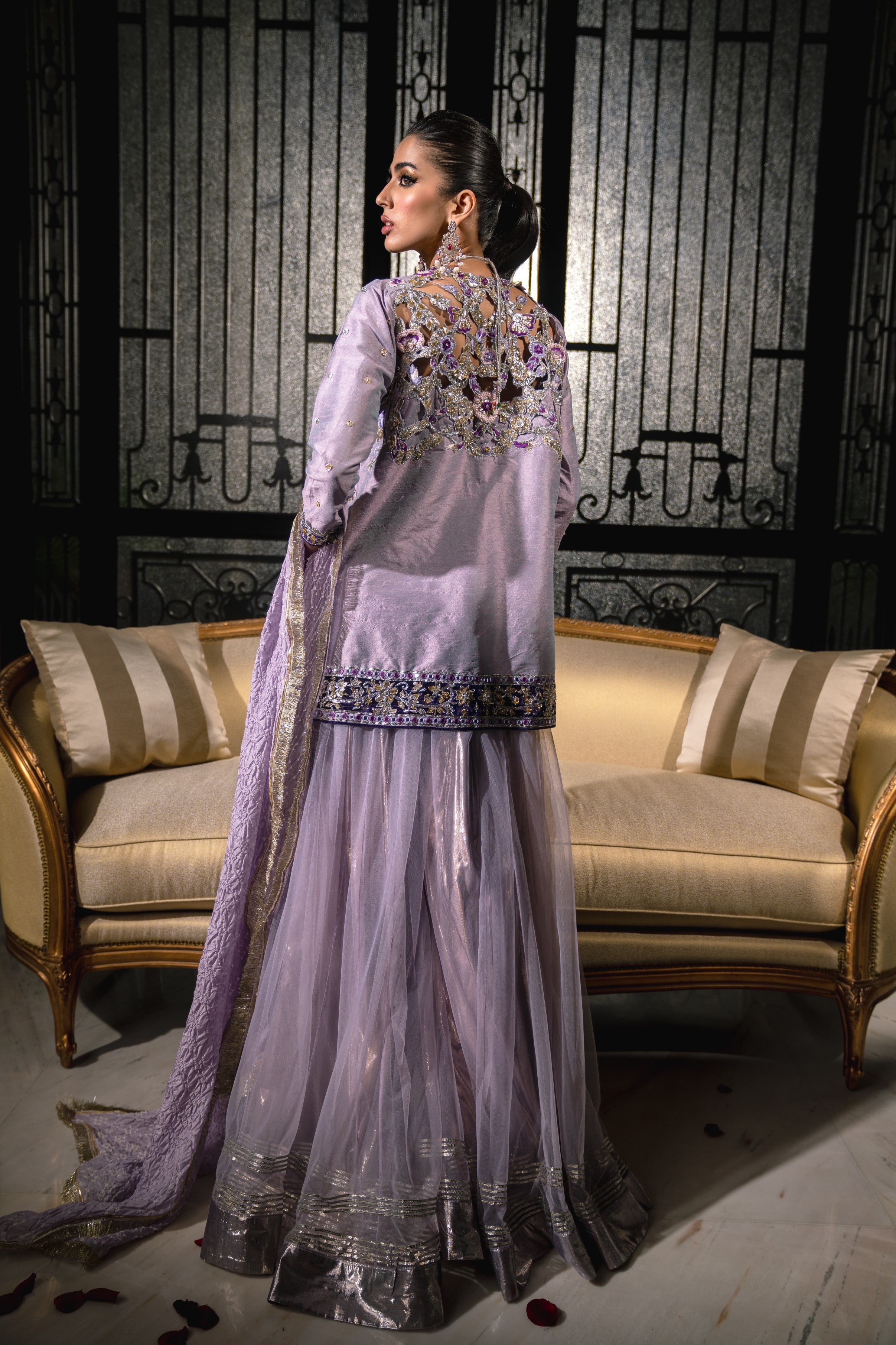 Reinventing the traditional gota technique using a fusion of resham zari and beads to create feminine gam like no other. An absolute master piece of dazzling hand craftsmanship. A geometric floral design created using gota pati with a handworked velvet border further accentuated with an intricately worked gota cutwork back detail.