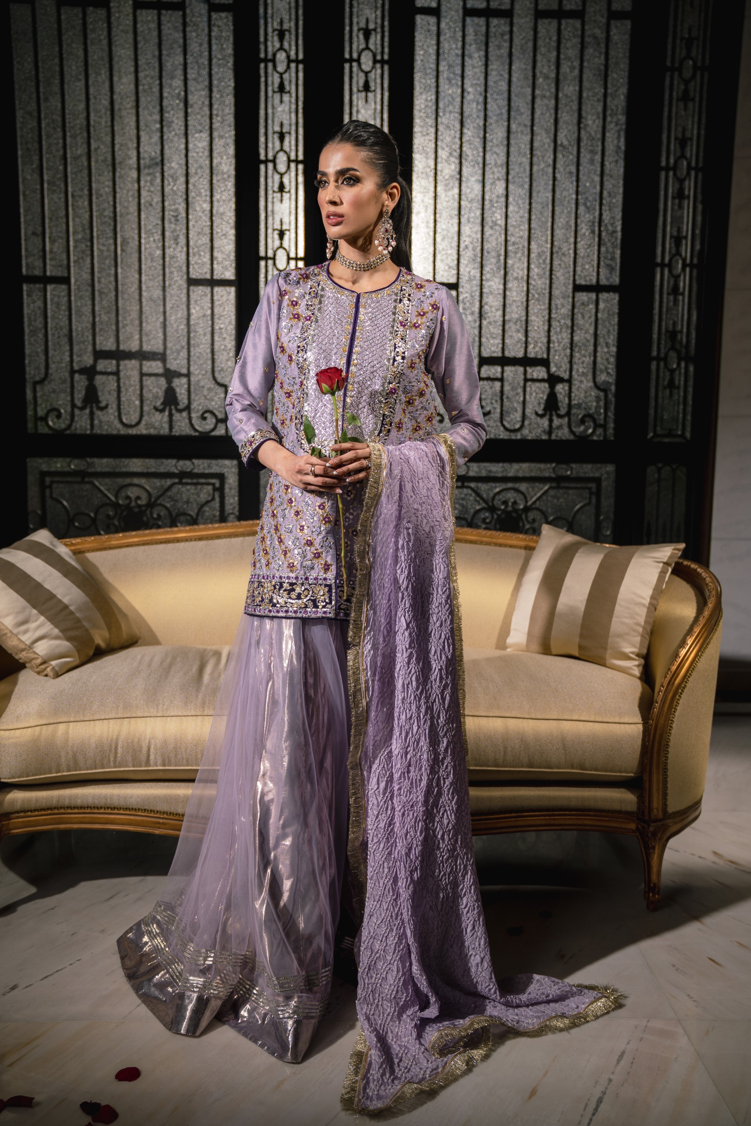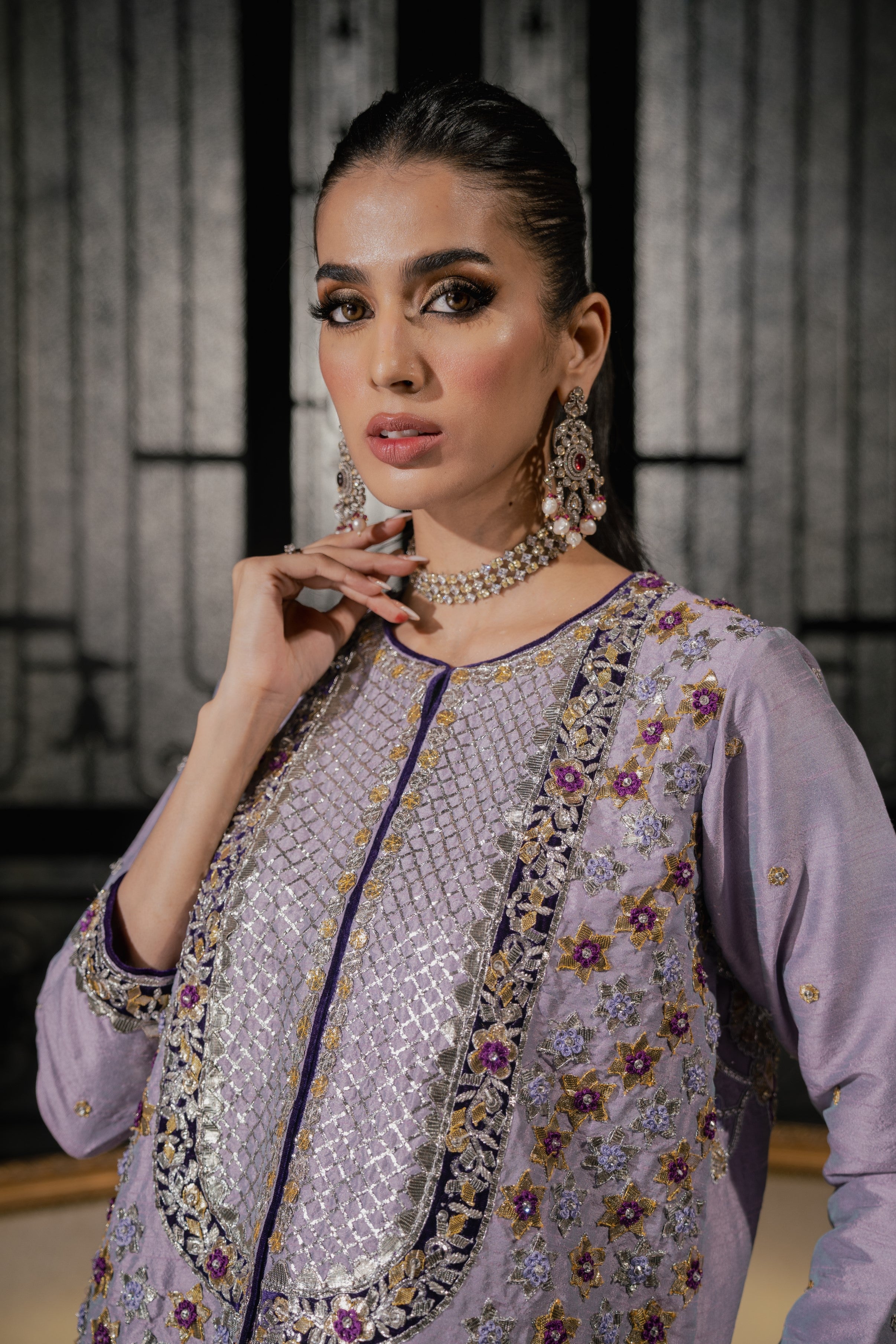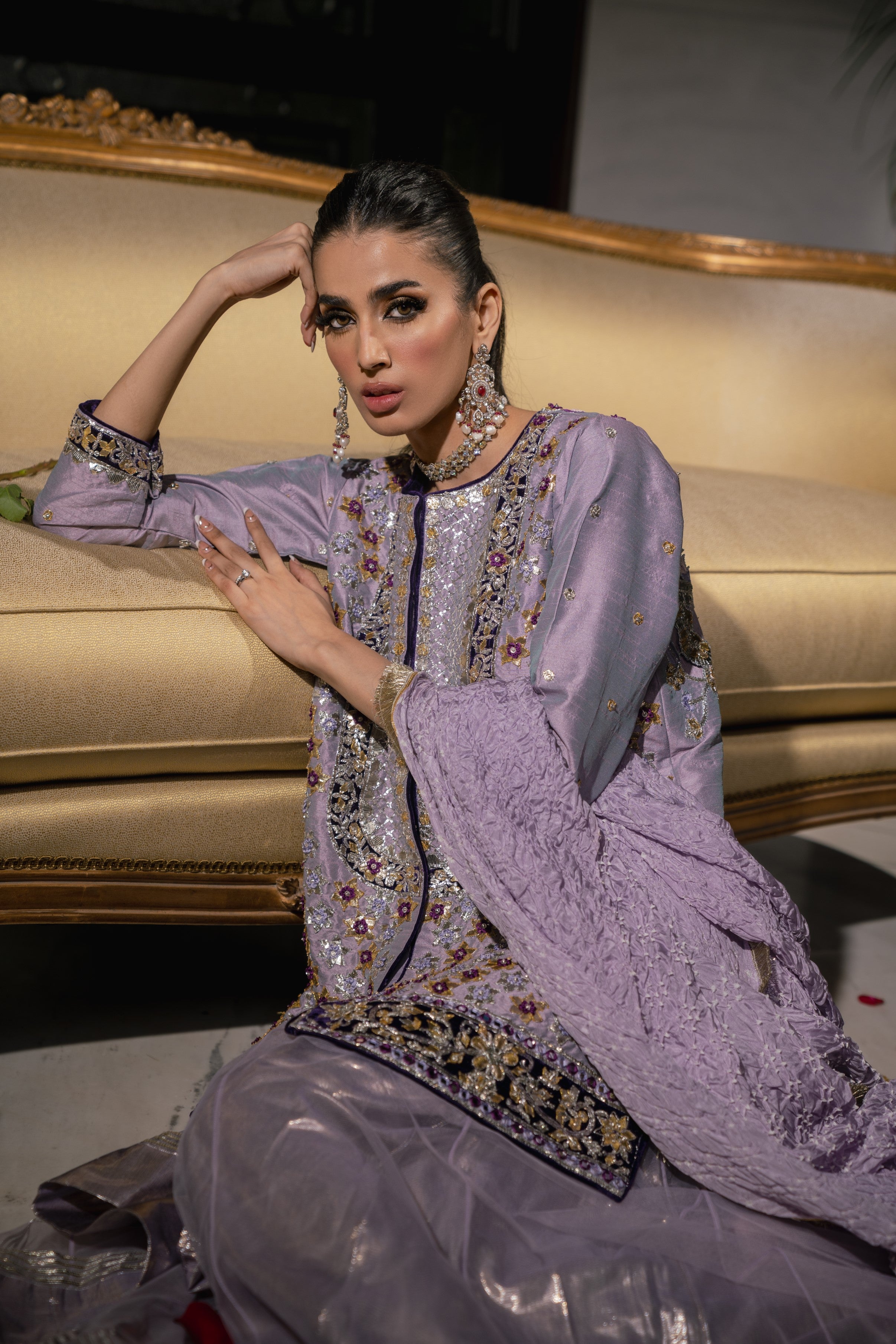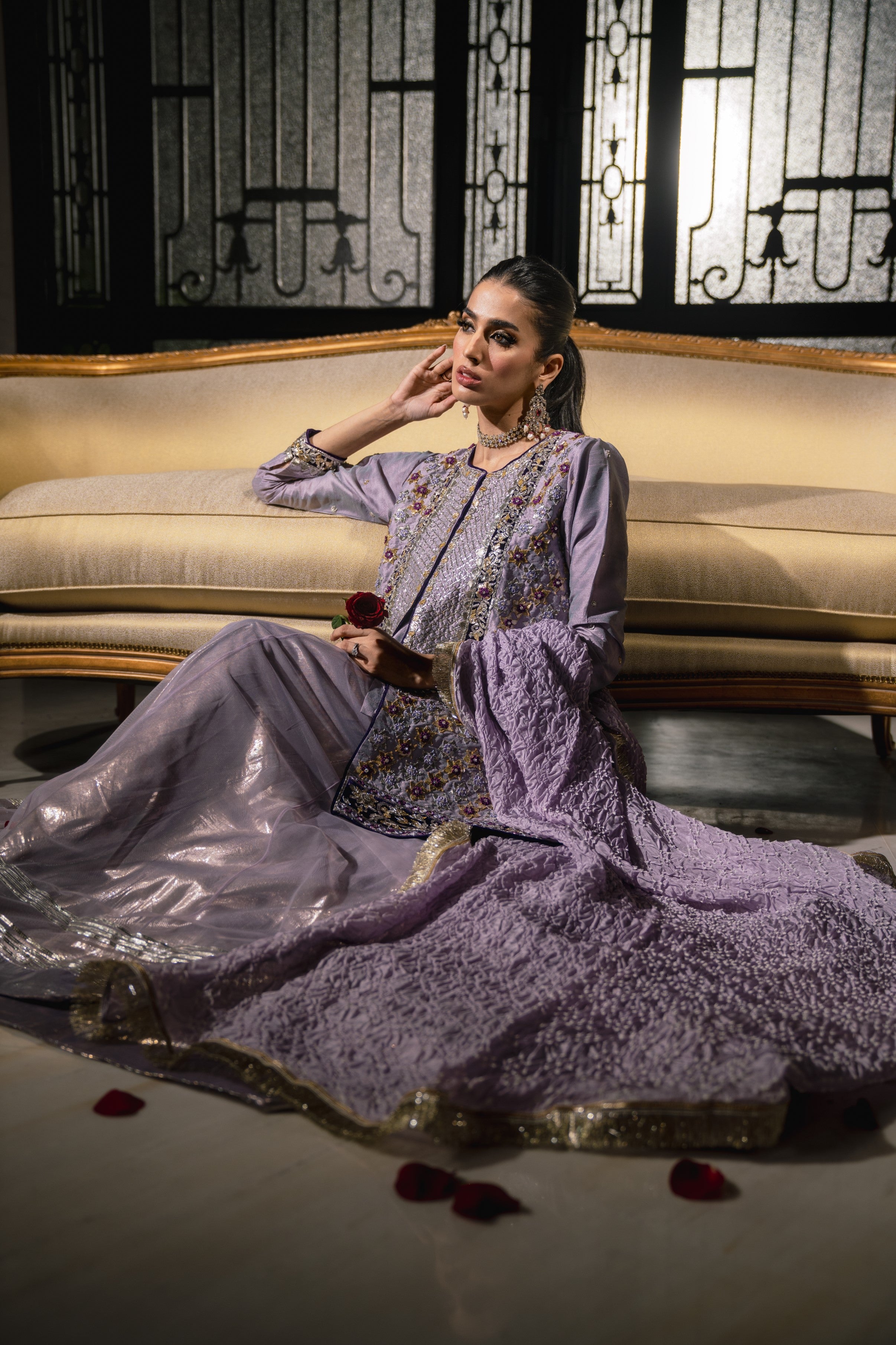 Reinventing the traditional gota technique using a fusion of resham zari and beads to create feminine gam like no other. An absolute master piece of dazzling hand craftsmanship. A geometric floral design created using gota pati with a handworked velvet border further accentuated with an intricately worked gota cutwork back detail.